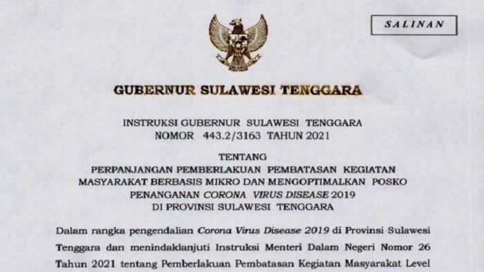 Dalam rangka pengendalian Corona Virus Disease 2019 di Provinsi Sulawesi Tenggara dan menindaklanjuti Instruksi Menteri Dalam Negeri Nomor 26 Tahun 2021 tentang perpanjangan PPKM level 3, level 2 dan level 1.