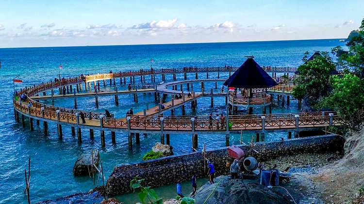 Kunjungi Pantai La Poili di Buton Selatan, tawarkan pemandangan laut dari atas dermaga melingkar di bibir pantai.