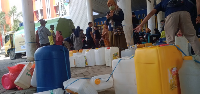 Warga pun antusias mengantre untuk mendapatkan minyak goreng curah. Terlihat warga membawa botol kemasan minuman, jerigen, termos, hingga galon.