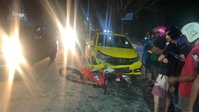 "Sepeda motor CRF tanpa pelat yang dikendarai oleh korban berinisial I tersebut terpental ke jalur sebelah kanan dan ditabrak oleh mobil Honda Brio," tuturnya.
