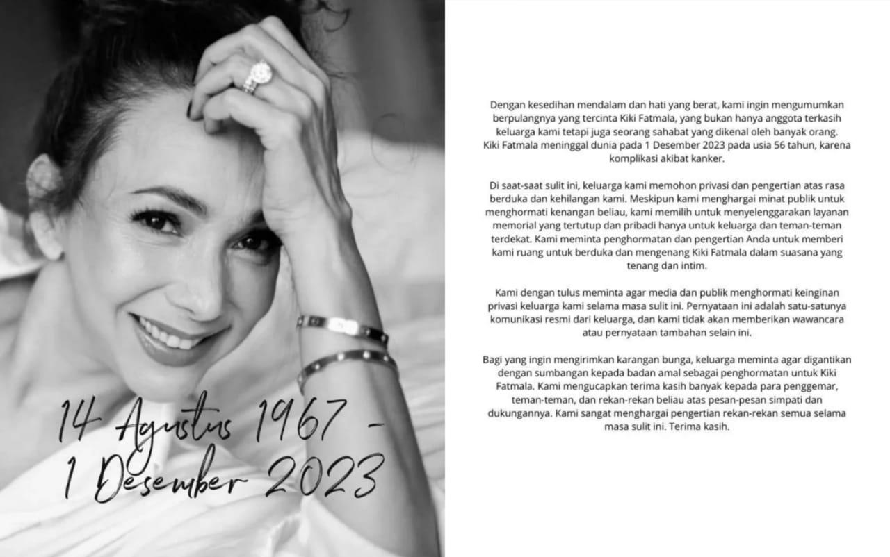 "Dengan kesedihan mendalam dan hati yang berat, kami ingin mengumumkan berpulangnya yang tercinta Kiki Fatmala, yang bukan hanya anggota terkasih keluarga kami tetapi juga seorang sahabat yang dikenal oleh banyak orang. Kiki Fatmala meninggal dunia pada 1 Desember 2023 pada usia 56 tahun, karena komplikasi akibat kanker," tulis keterangan duka, dikutip TribunnewsSultra.com, Jumat (1/12/2023).