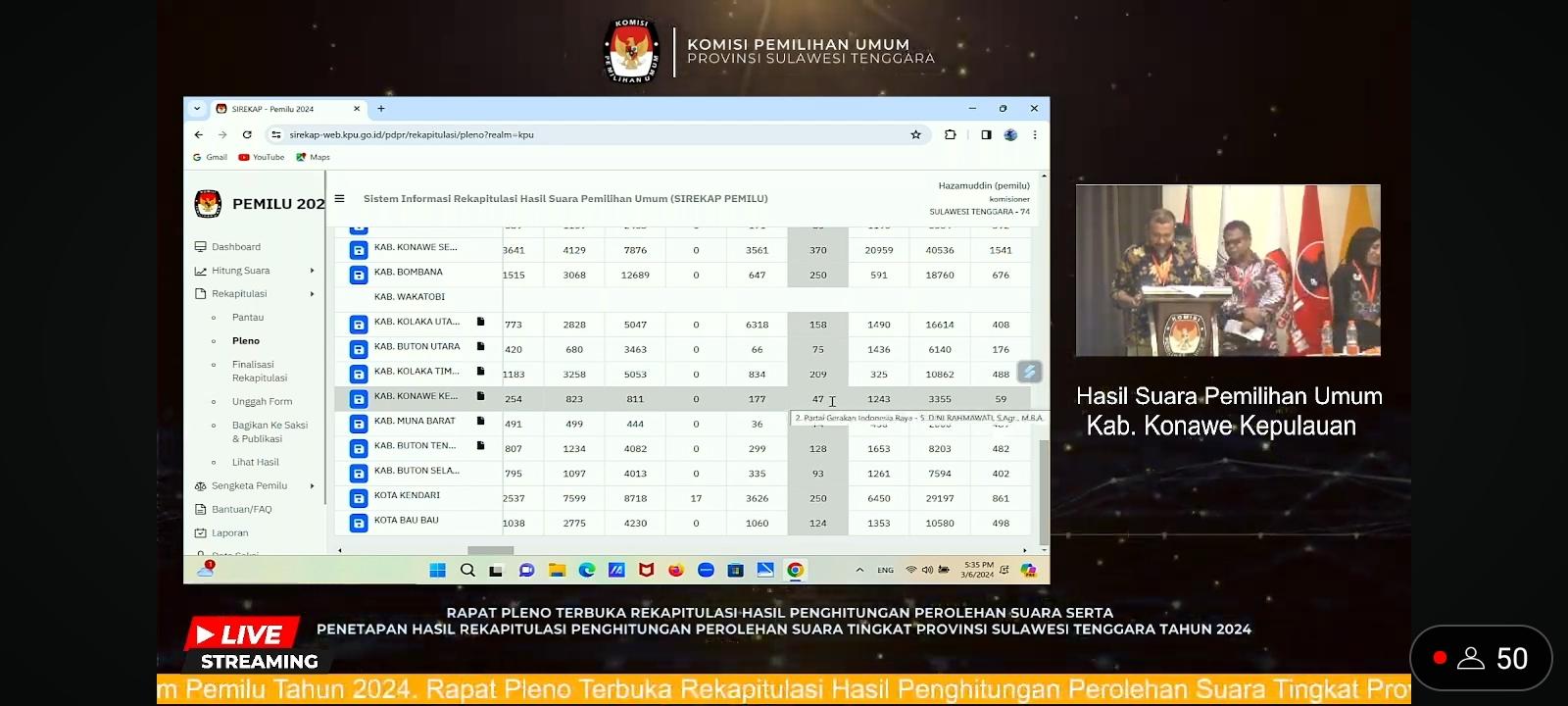 Rekapitulasi KPU Sultra, Dewa Putu, Umar Bonte, Leni dan Rabia Unggul DPD RI di Konawe Kepulauan