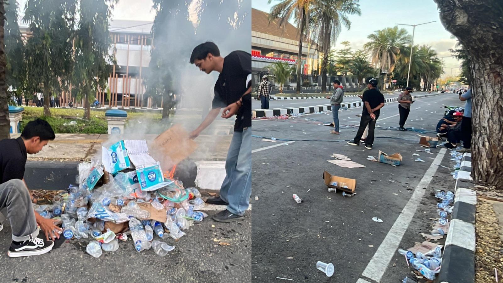 Tak hanya di pinggir Jalan Abdullah Silondae, di dalam kawasan Kantor DPRD Sultra pun terdapat banyak sampah bekas minuman massa aksi.