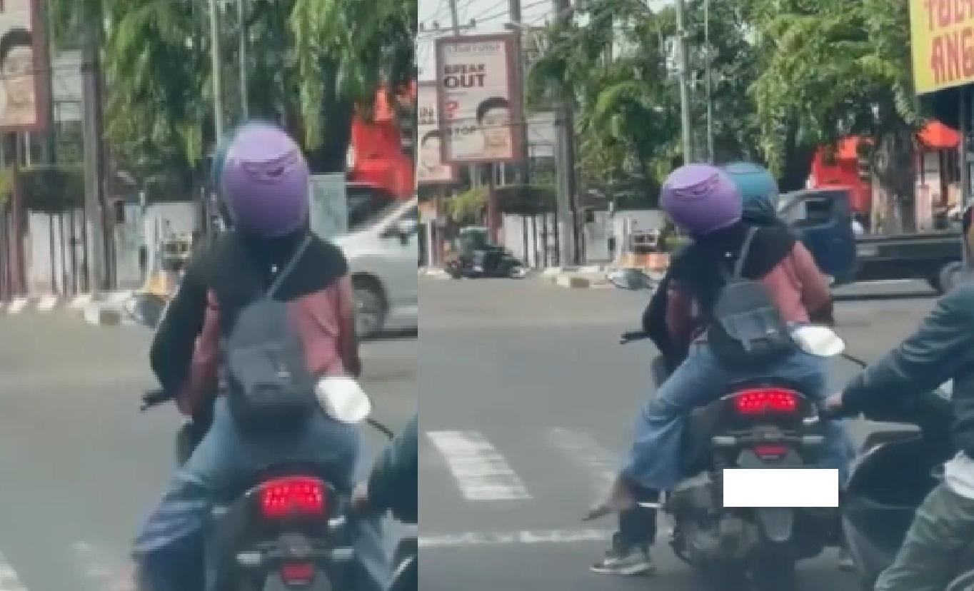 Beredar video viral TikTok menunjukan seorang emak-emak yang nampak rewel di atas motor. Ia menggoyangkan kakinya ke kiri dan ke kanan.